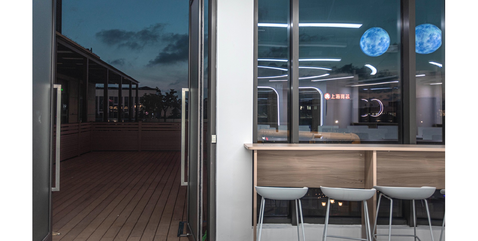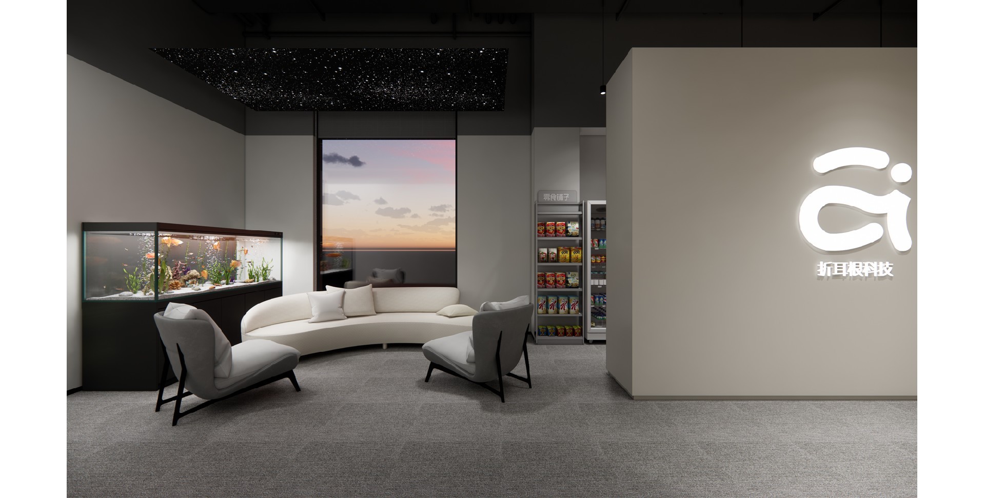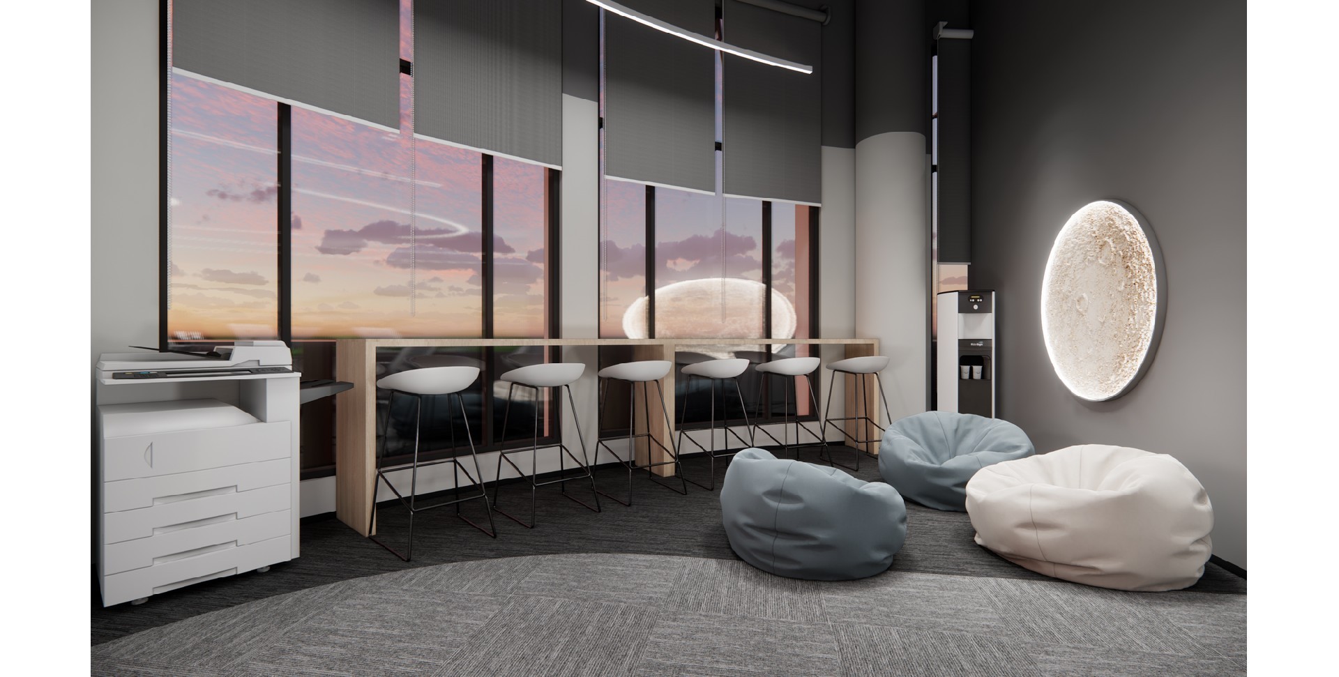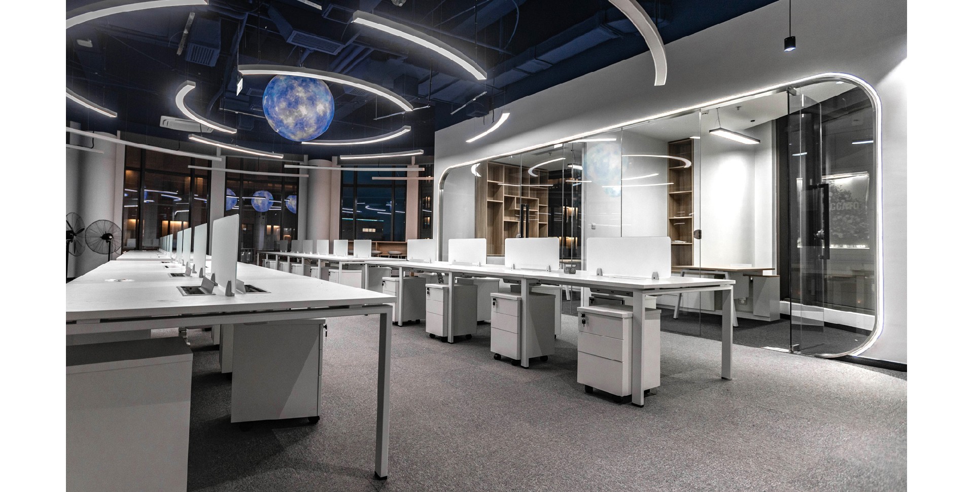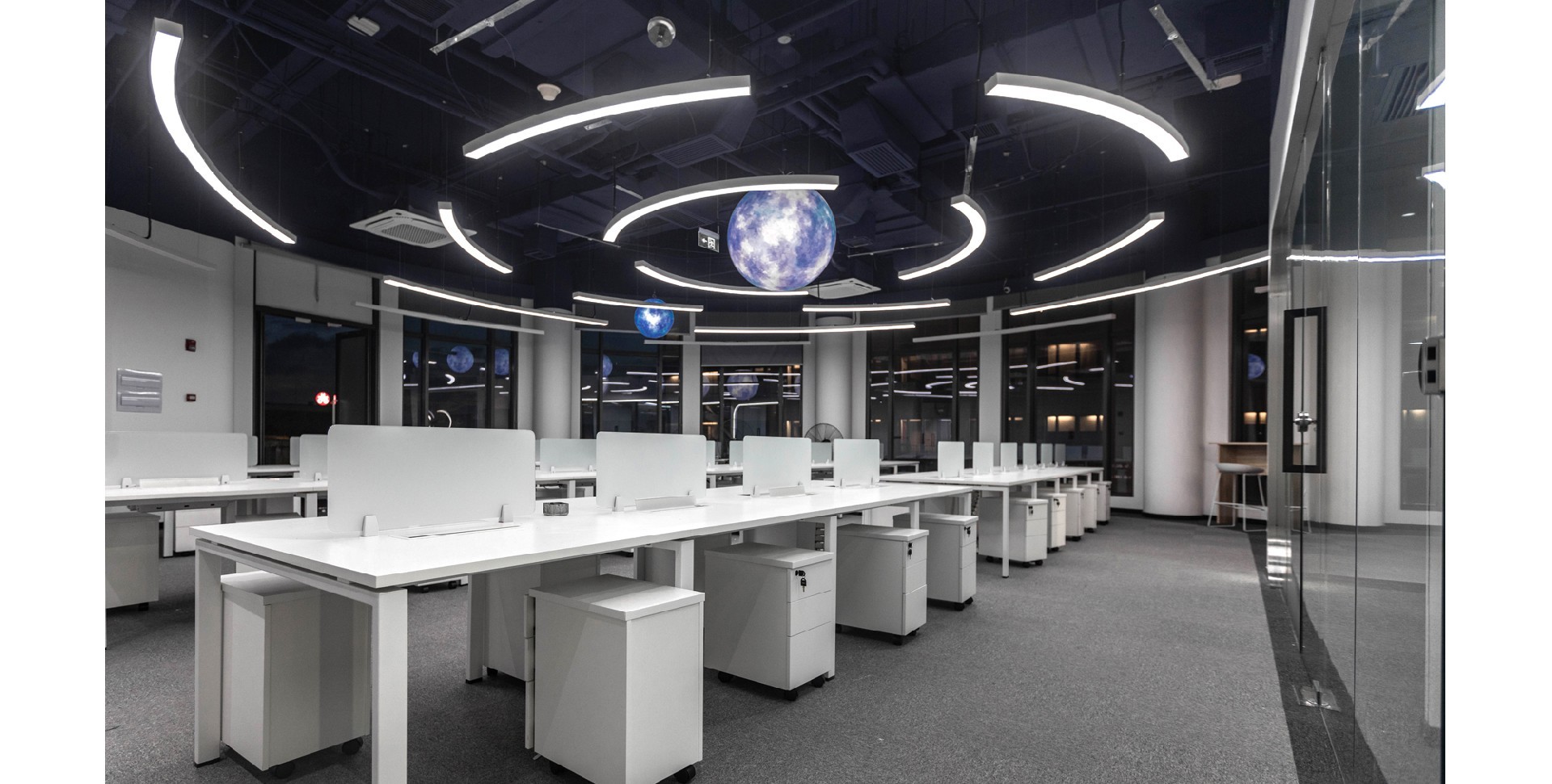 辦公室采用了現(xiàn)代簡約的設(shè)計風(fēng)格,體現(xiàn)了現(xiàn)代辦公環(huán)境的專業(yè)性和高效性。以白色和深色為主色調(diào),白色代表純潔、明亮,深色則賦予空間穩(wěn)重感。頂部加入行星的科技元素,增加了空間的活力與視覺焦點,象征著廣闊與未來。
