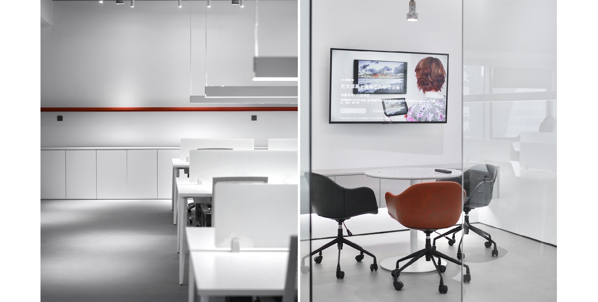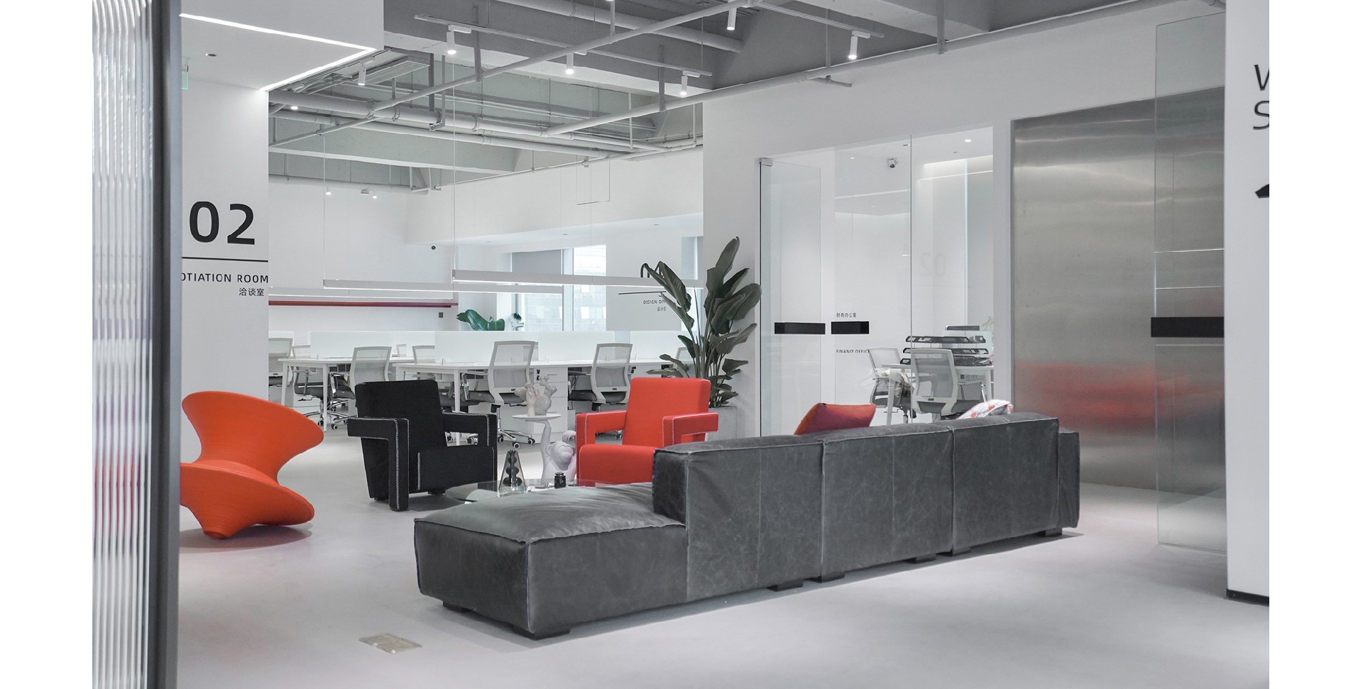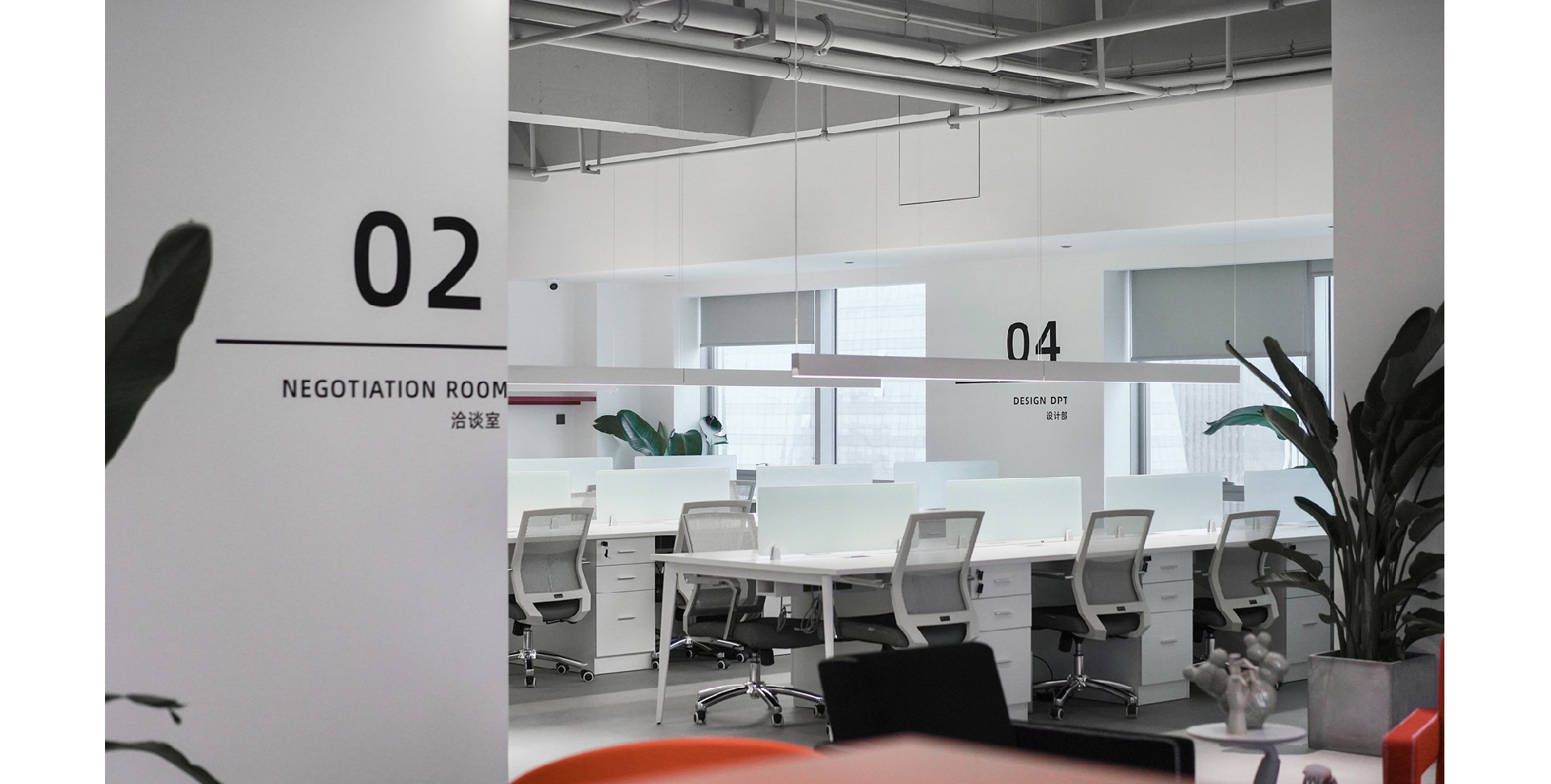 辦公室以白色和紅色為主色調(diào),營造出簡潔而時尚的氛圍。整體布局寬敞,光線充足,展現(xiàn)了現(xiàn)代辦公環(huán)境的開放性和舒適性。強調(diào)空間的通透性和自然光的利用。為員工創(chuàng)造一個明亮、舒適的工作環(huán)境。